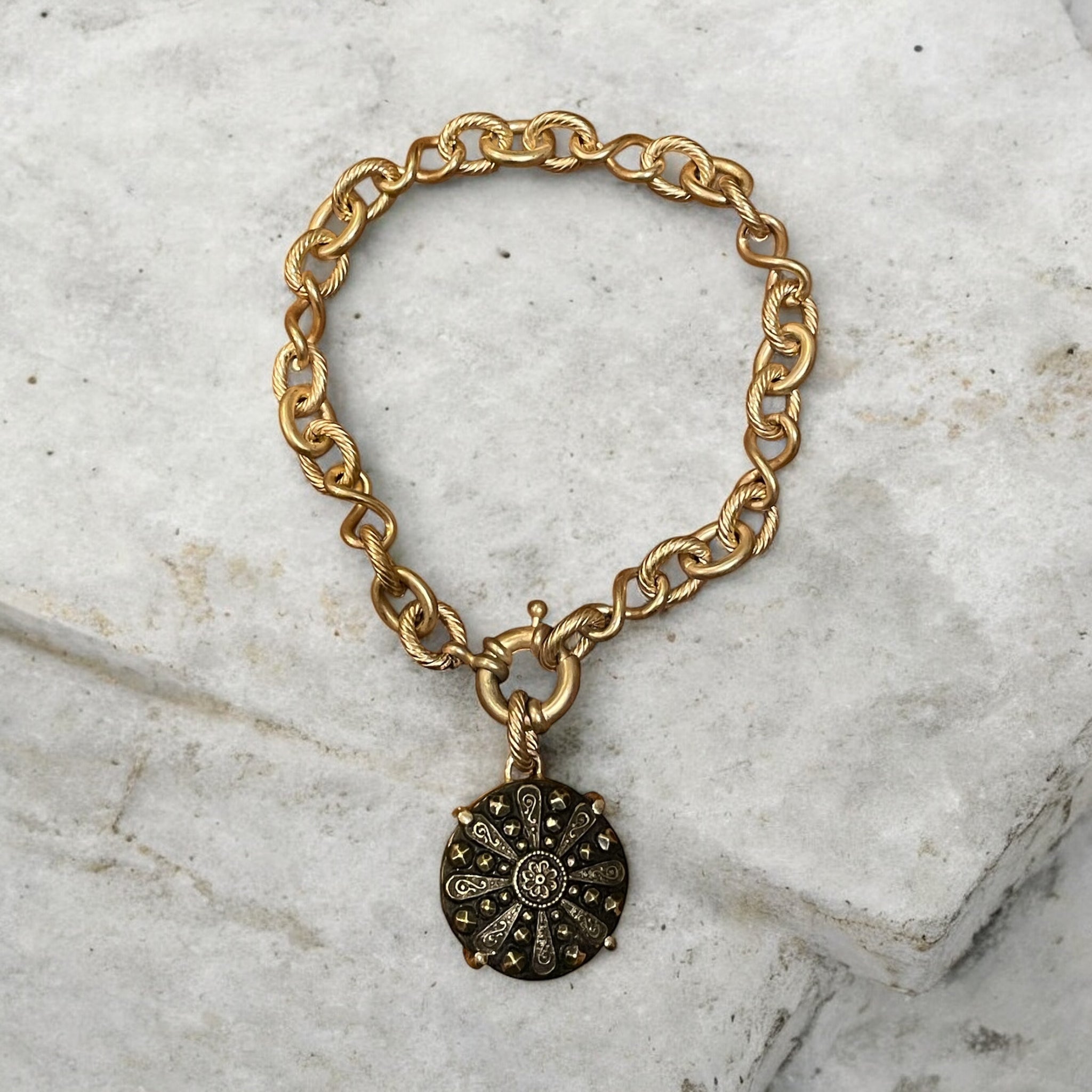 As with most Antique Hunt Designs, there is only one of these, so when it’s gone, it’s gone! A gorgeous antique Art Deco button in collector condition is hand prong set in a bronze bezel & suspended on a heavy gold-plated brass chain with a spring ring closure. The chain is 8.25”, but can be made smaller, if desired - call to inquire.