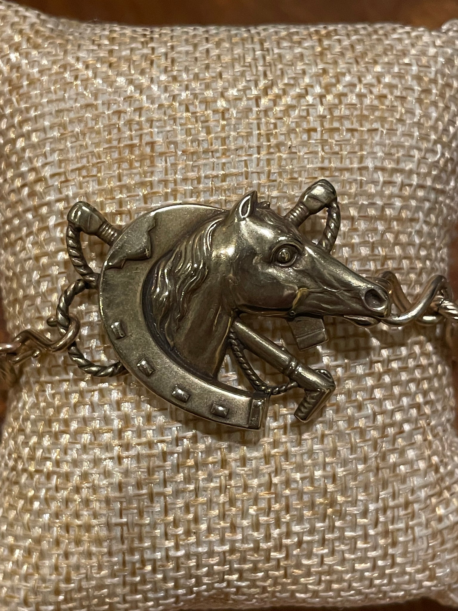 The lovely lucky hunt horse catch on this bracelet is also the main attraction! An Antique Hunt Designs original, it was cast in bronze using the lost wax method, from a mold of a late 1800’s brooch. The chain is heavy gold-plated brass.