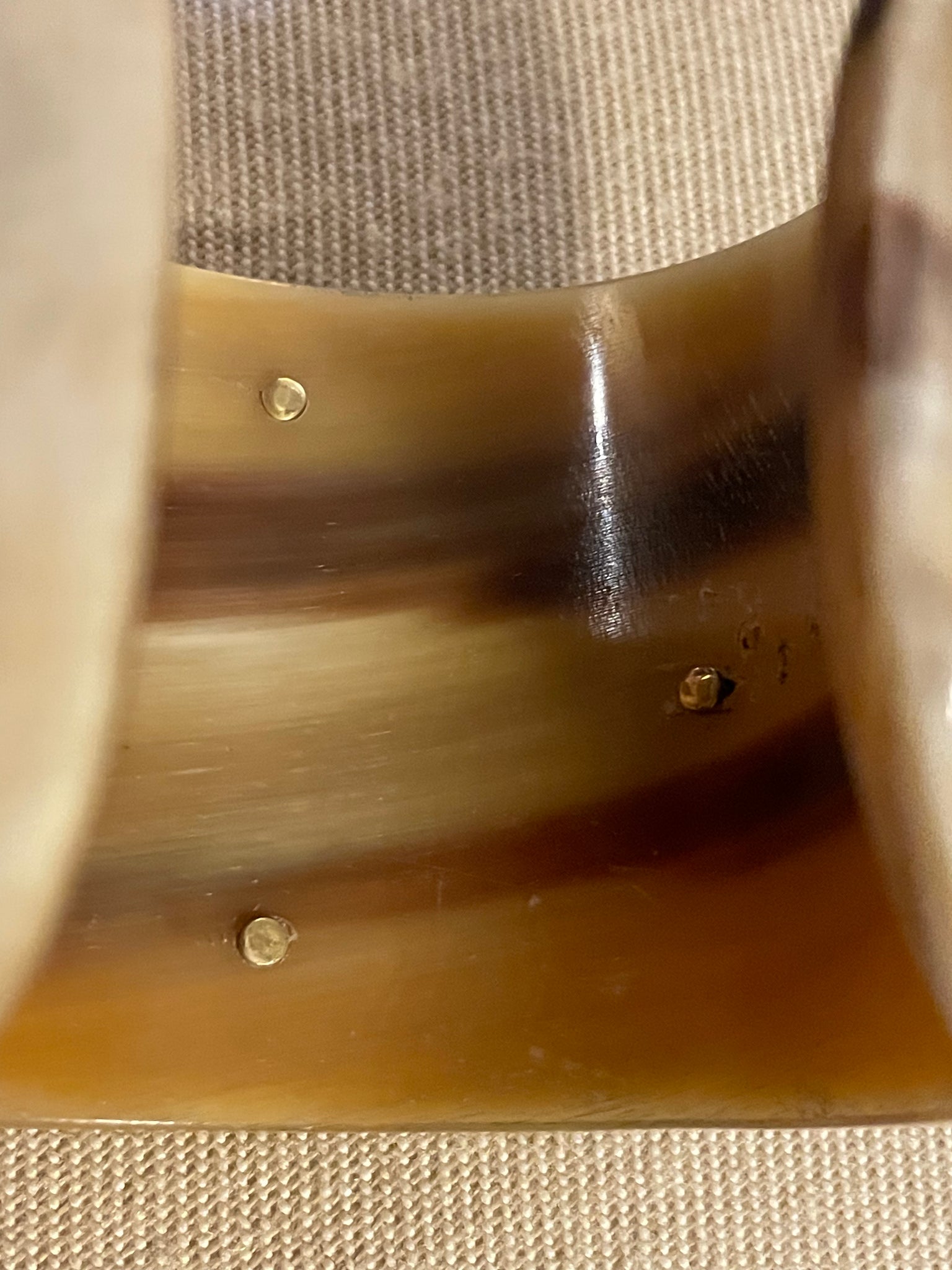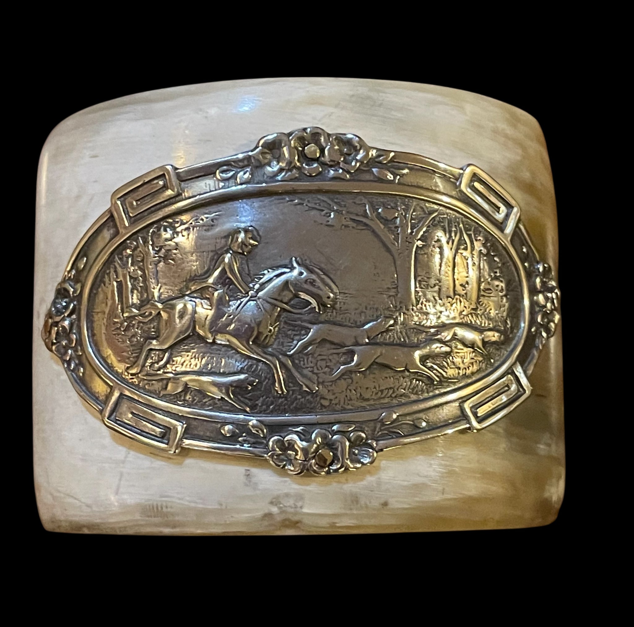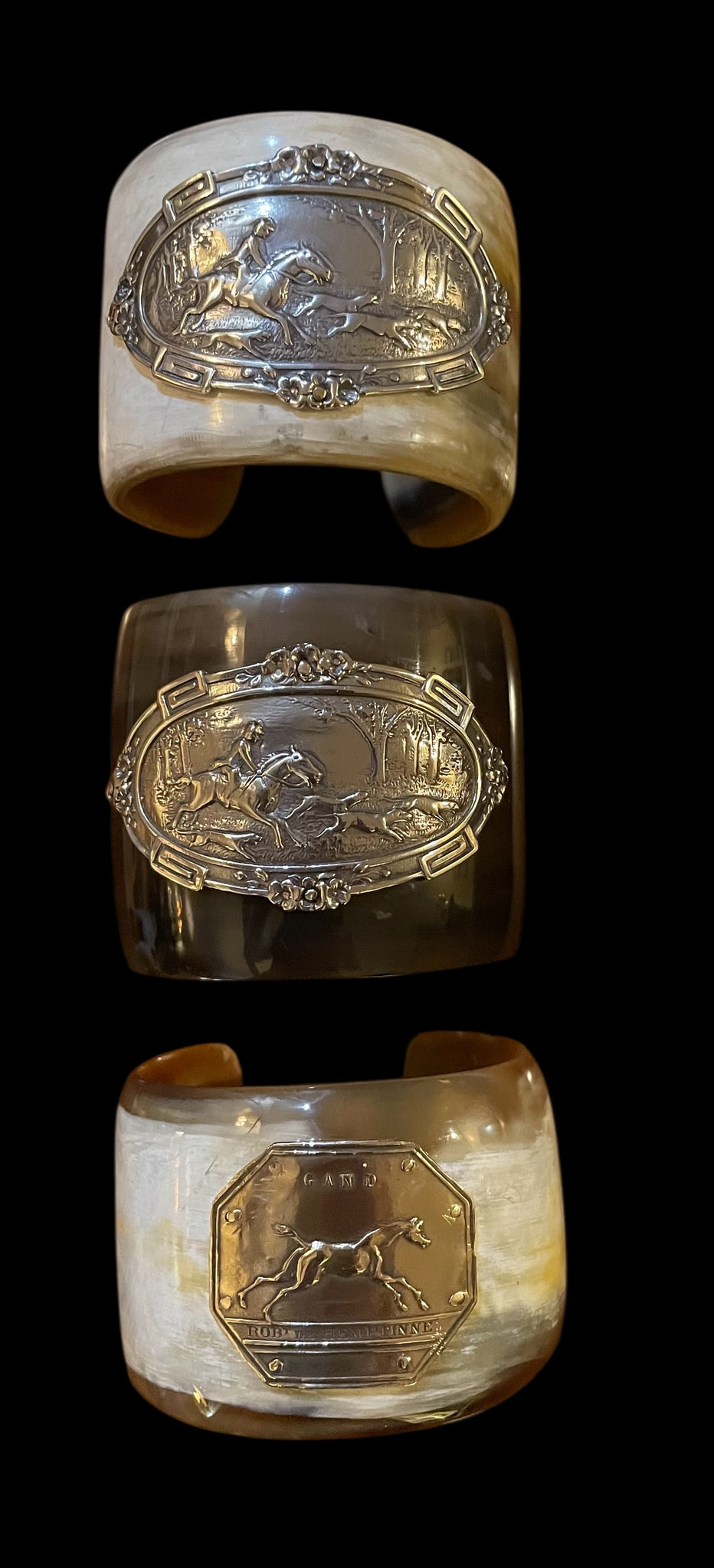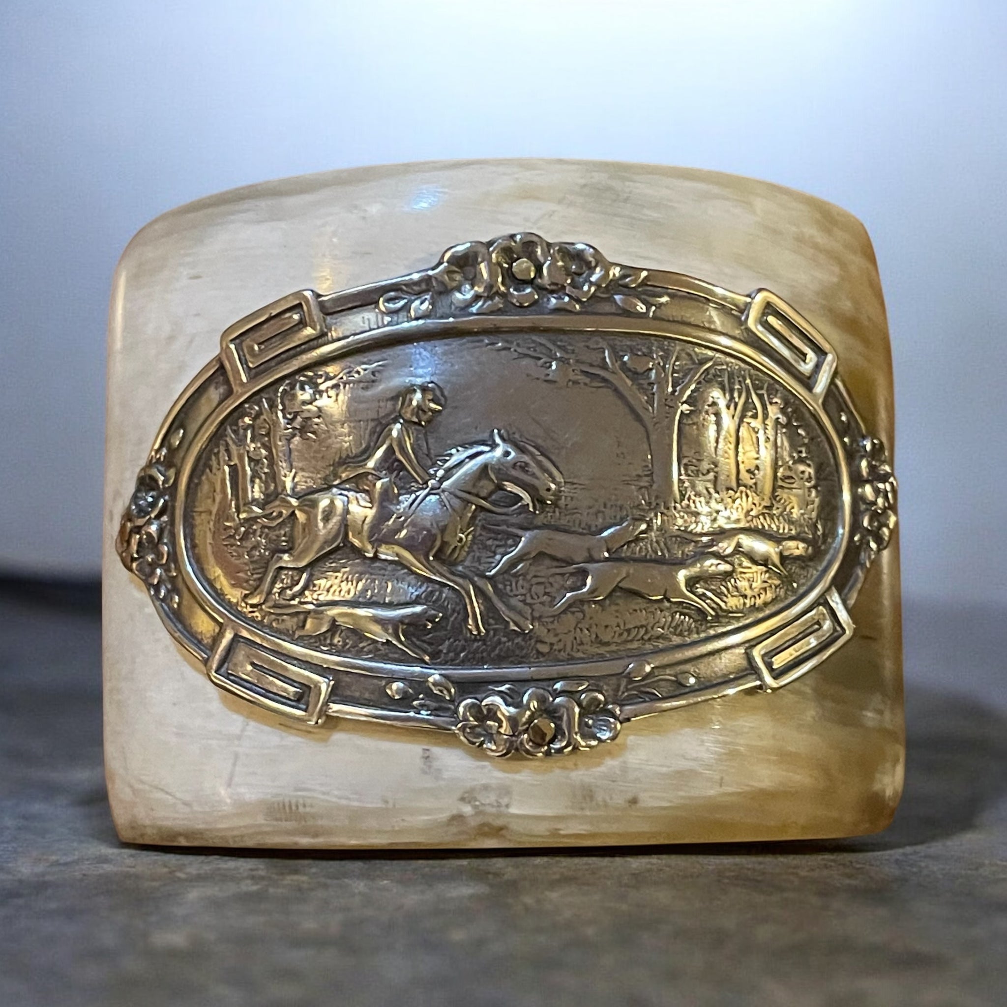 This lovely cuff bracelet is an Antique Hunt Designs handmade original. The hunt scene was cast in sterling using a mold of a vintage belt buckle. It has been hand fitted with brass rivets to this natural, light colored wide (2 1/4") water buffalo horn cuff. The interior of the cuff is 2.5" wide, which should fit an average SM-MED wrist. The opening to the cuff is 1 1/8" wide, however, which is somewhat narrow for these hand carved, imported cuffs. These cuffs have some, but not much, flexibility, so this dimension is important for proper sizing. Similar cuffs can be custom ordered - see other listings.