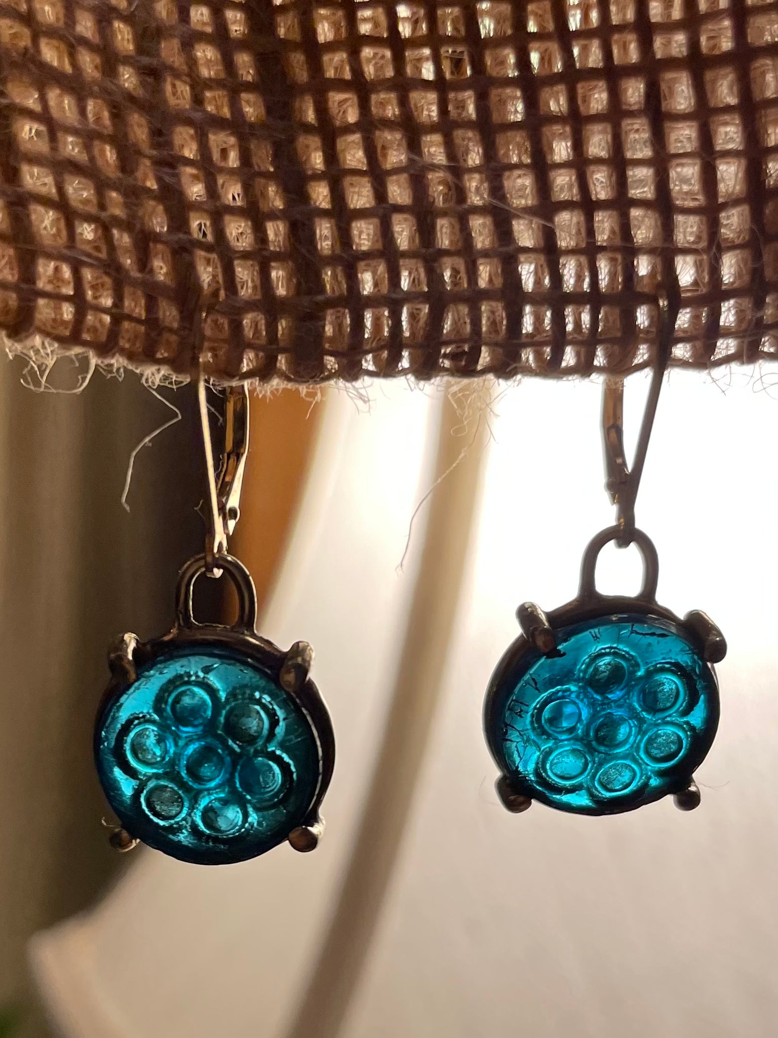 This pair of highly collectible and hard-to-find antique pressed glass buttons makes stunning earrings! The brilliant Caribbean blue color is especially beautiful in the light. Each button has been carefully prong set, by hand, in bronze bezels, so the integrity of the buttons is preserved. The buttons are suspended from high quality 1/20 14 kt gold-filled earwires with hinged French closure. Unless & until we can locate another matched pair of these fab buttons and make another set of earrings, this is our only pair.