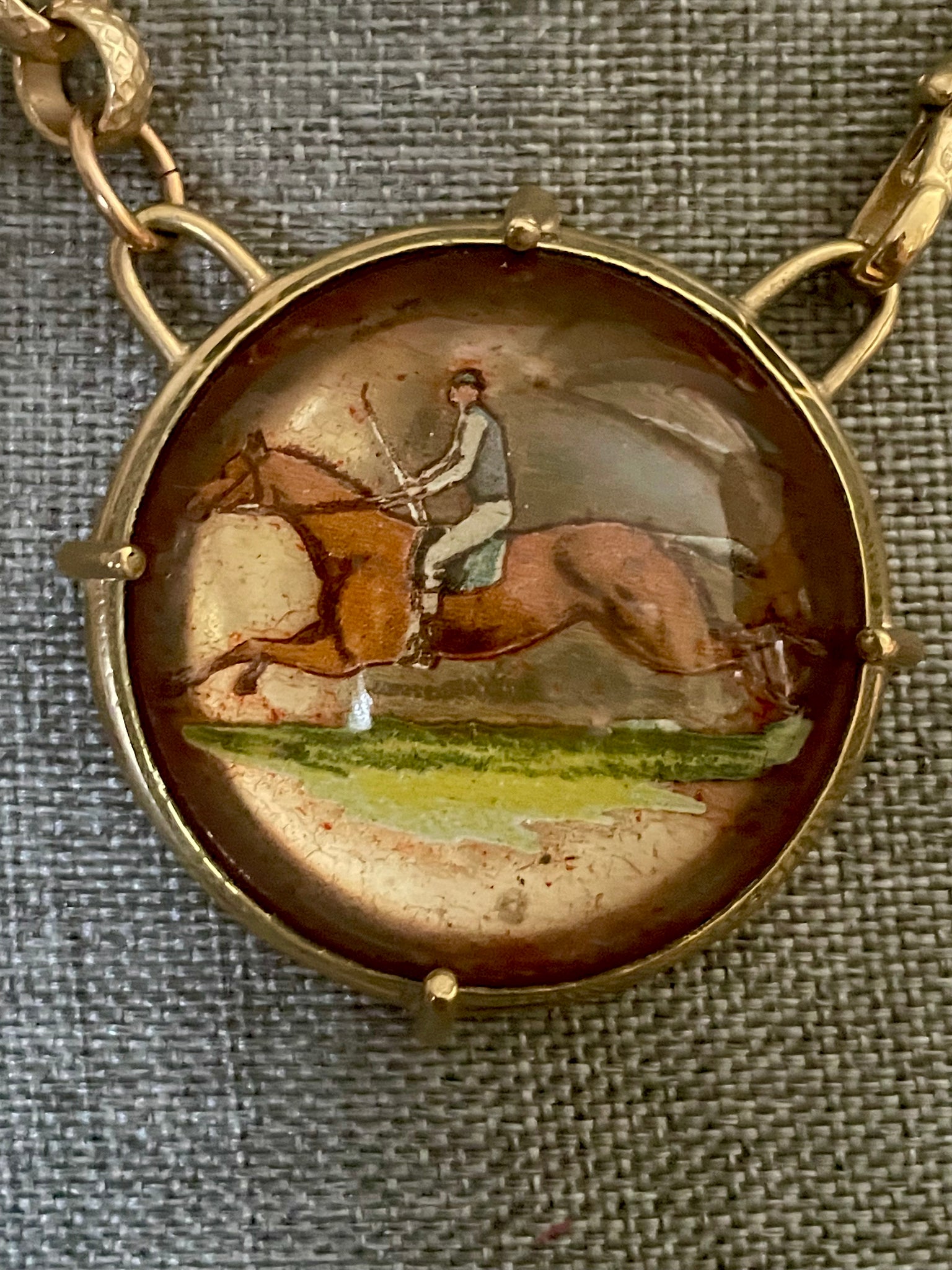 This beautiful large brass mounted crystal racehorse was originally a bridle rosette. The background is a glorious metallic gold edged in red, with brilliant green grass. The jockey has grey blue colors. At some point it was converted to a brooch Now it is mounted on a bronze bezel and adorns this gold-plated watch style chain as a pendant. This is an original AH Designs necklace. You will be noticed with this glorious necklace! 18”.