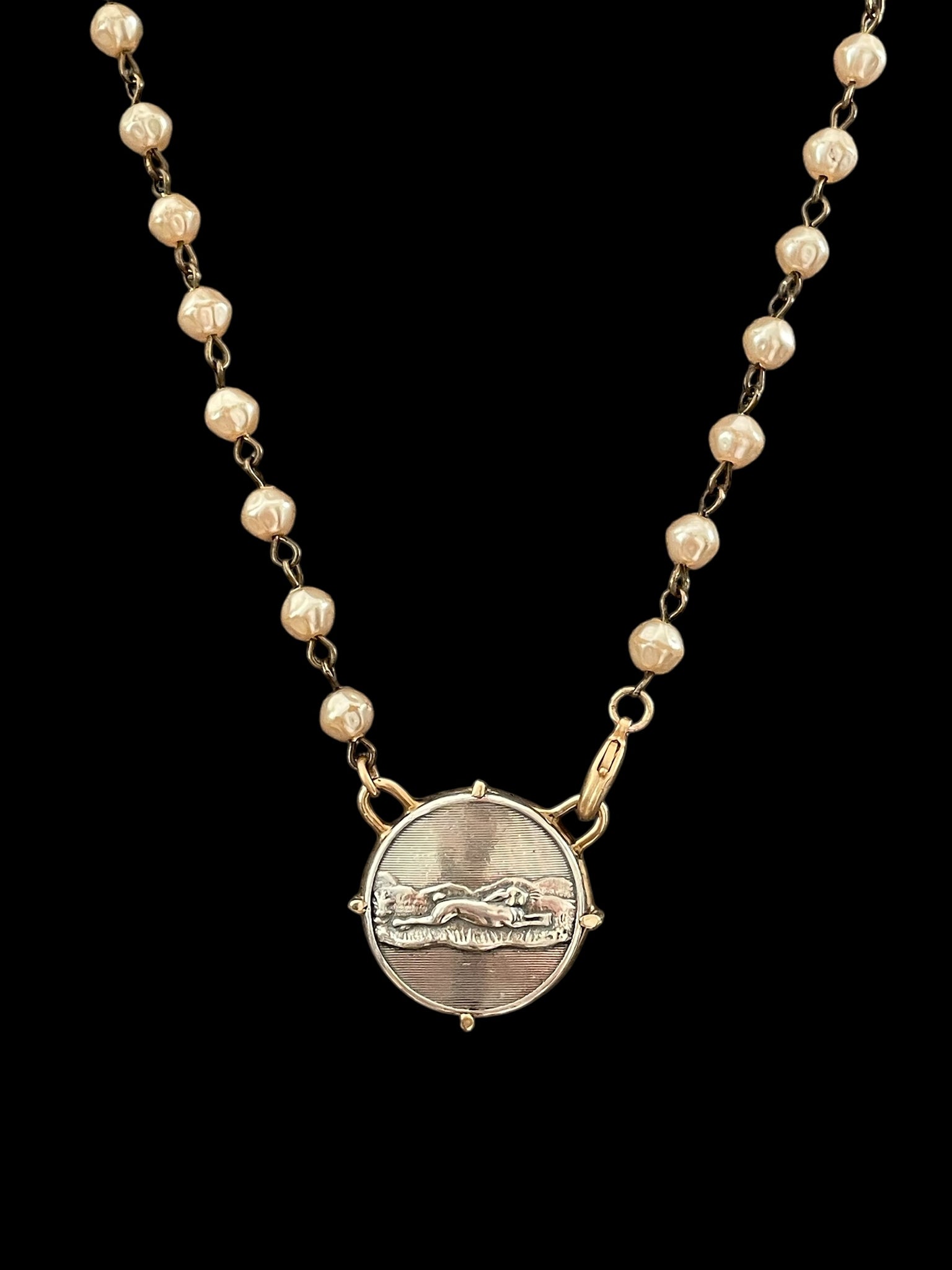 The Sterling racing rabbit was cast using the lost wax method from a mold of an antique button. It is set in Bronze and on a glass “pearl” chain with front closure.