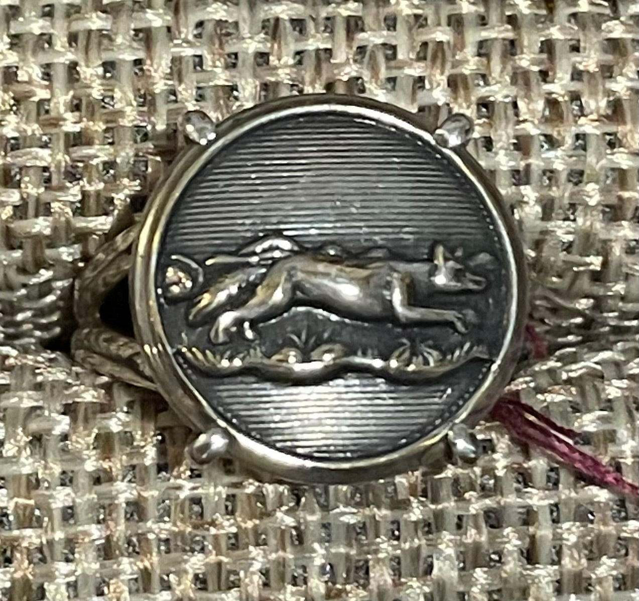 A silver colored metal running fox button is prong set in a sterling silver ring, size 4.5. The button is a modern reproduction of a fox hunting button popular in the early 1900’s, which allows us to offer this ring at a lower price point than those made of antique buttons or individually cast medallions. Other sizes & combinations available. Please inquire.