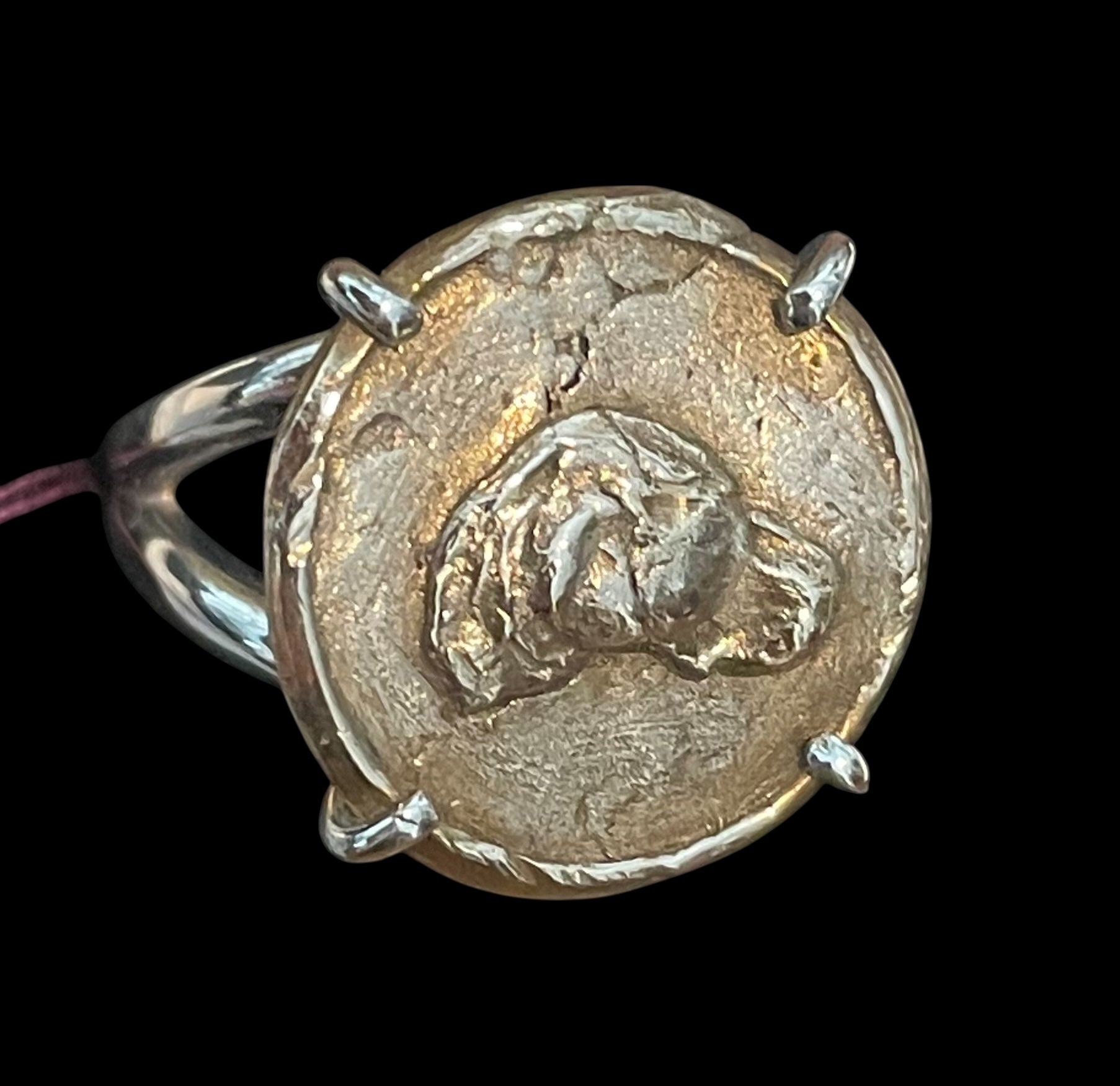 One Antique Hunt Designs specialty is making medallions from precious metal clay, like this bronze hound head. It was hand formed using a mold we made of an antique picture button. It is prong set in a sterling silver ring, size 7.